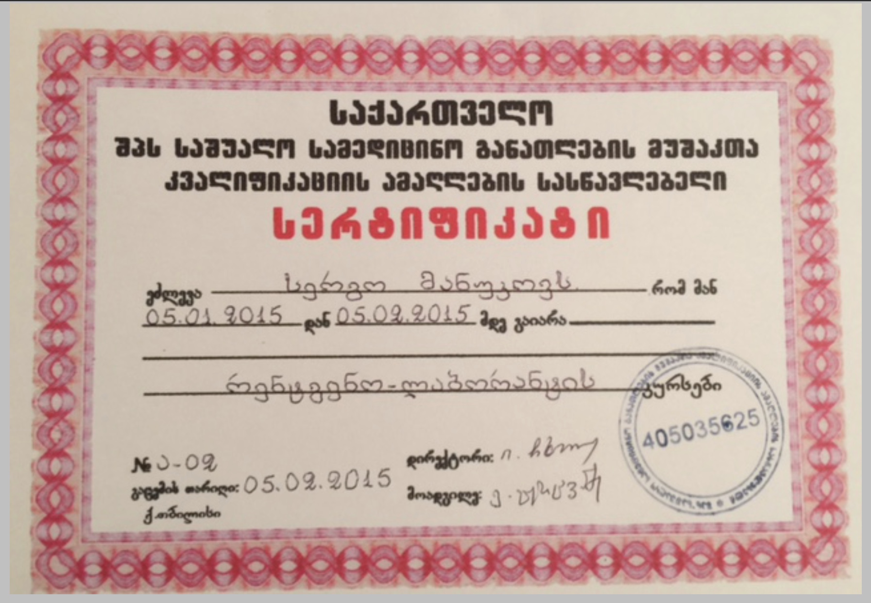 წარმატებით გაიარა ლიცენზირებული გამოცდები შეერთებულ შტატებში პირველადი სამედიცინო დახმარების, სტომატოლოგიისა და სტომატოლოგიური ჰიგიენის სპეციალობებში (BLS, JCNDE 2019 NBDE 1, NBDE 2, NBDHE).